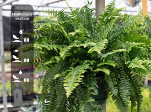 نفروپلیس اگزالتاتا که با نام سرخس بوستونی شناخته میشود، یکی از سرخسهای زینتی پرطرفدار است که بهدلیل برگهای پرپشت و آبشاریاش جلوهای خاص به فضاهای داخلی میبخشد. این گیاه در گلدانهای آویز یا روی پایه جلوهای بسیار چشمگیر دارد.
