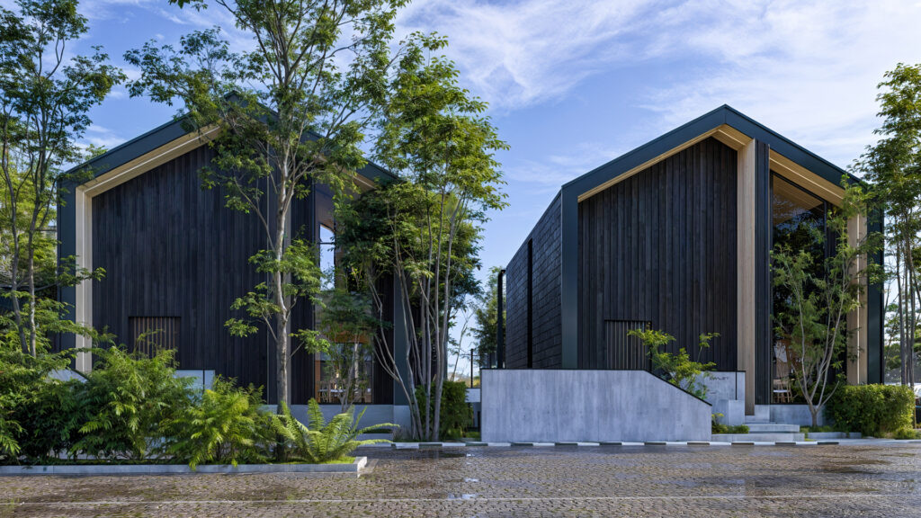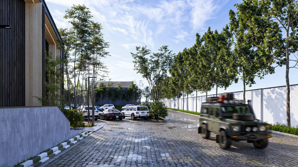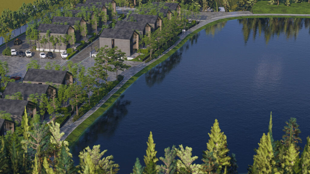 فضای سبز در هماهنگی کامل با معماری کلبهها شکل گرفته و نه بهعنوان المانی جدا، بلکه در تداوم زبان طراحی معماری حضور دارد.