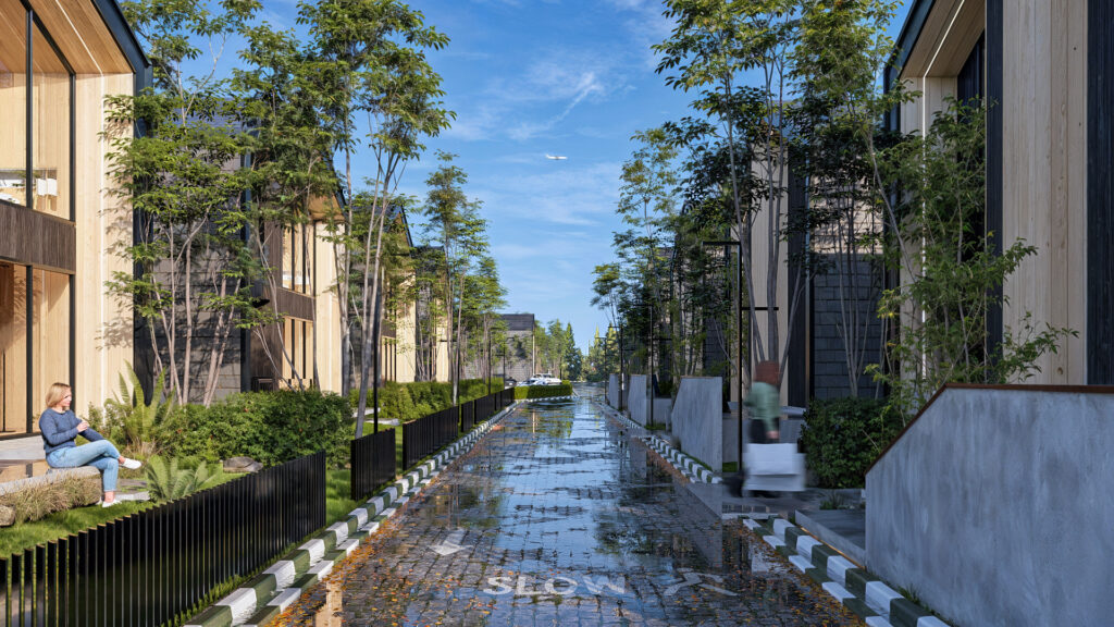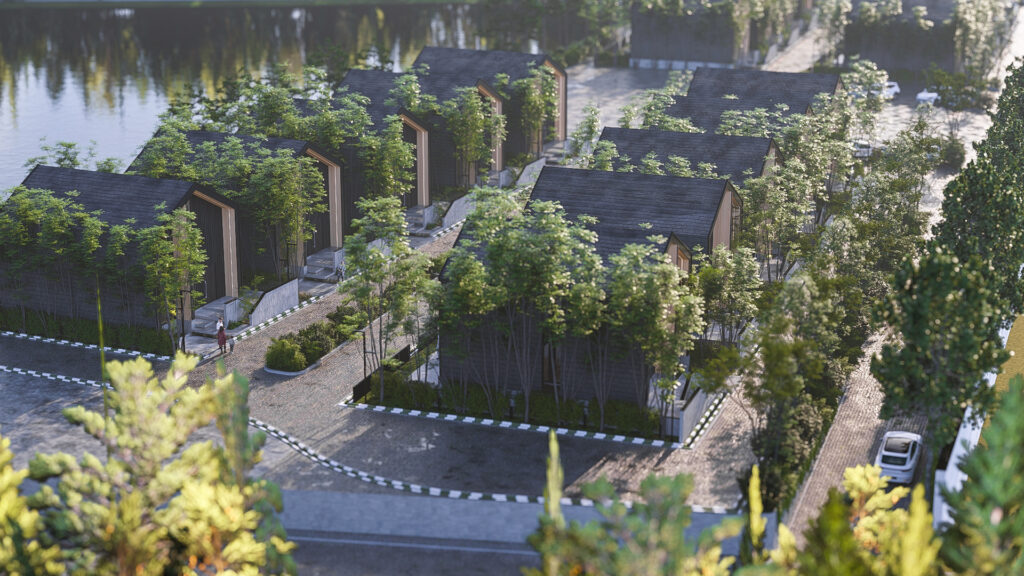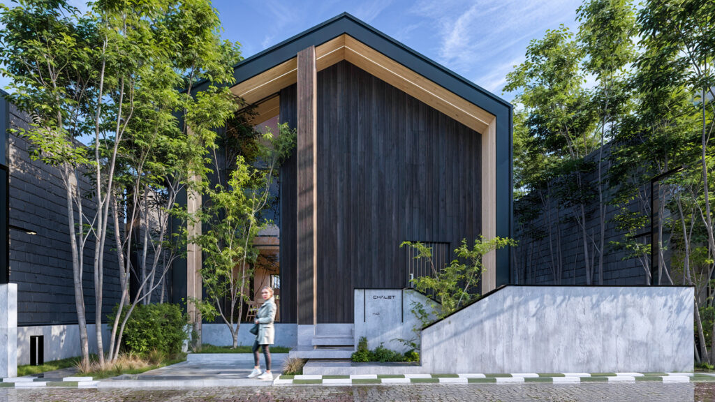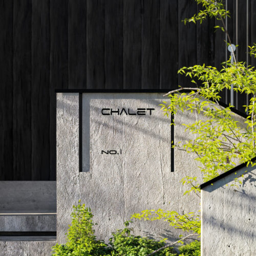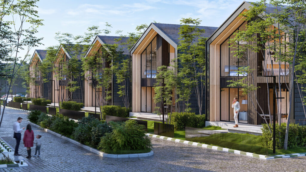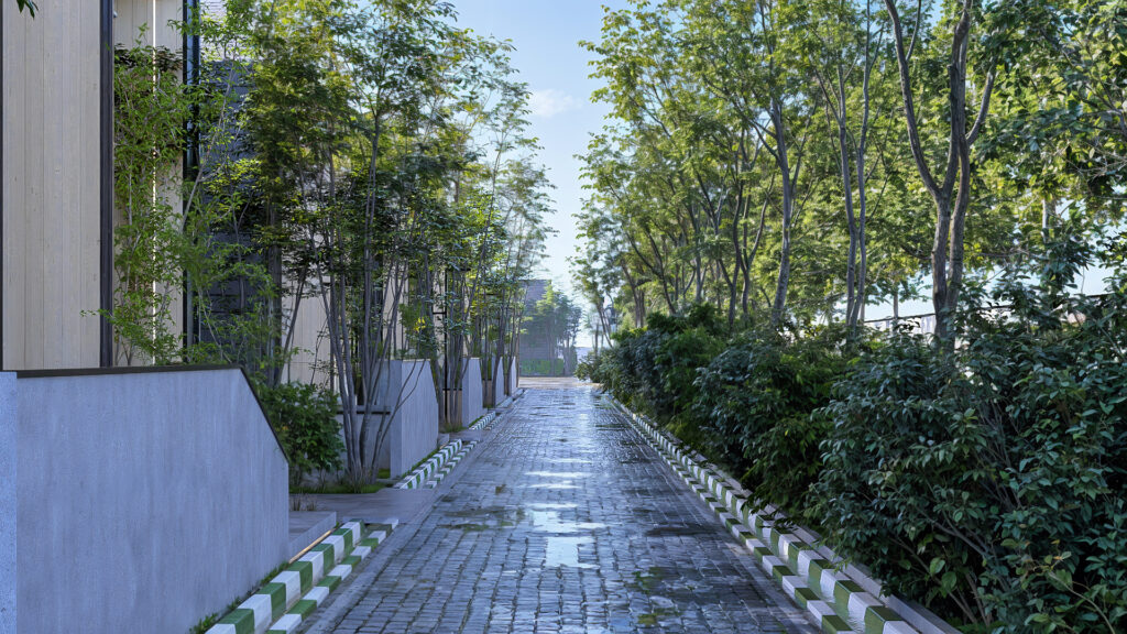 The greenery harmonizes with the architectural rhythm of the chalets, acting as a continuation of the built form rather than a separate element.