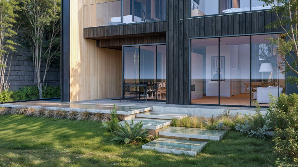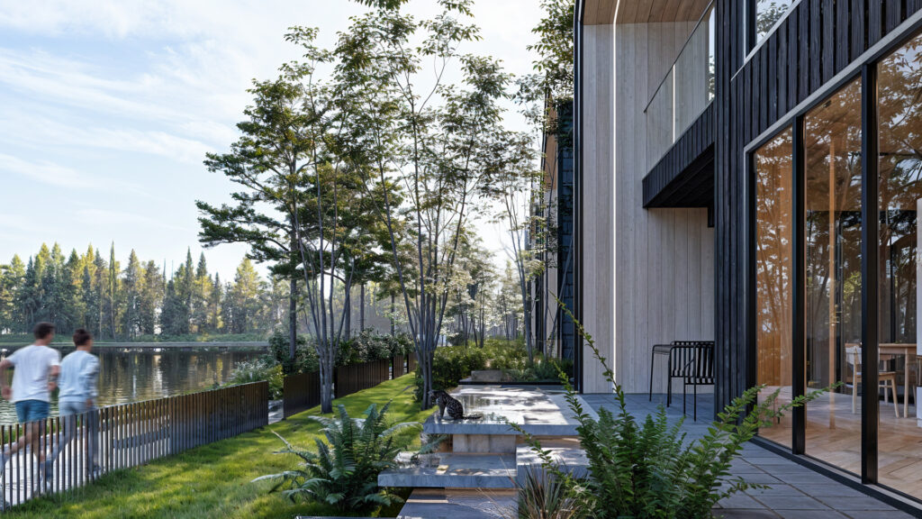 Instead of physical fences, vegetation defines privacy with softness and respect for the northern climate.