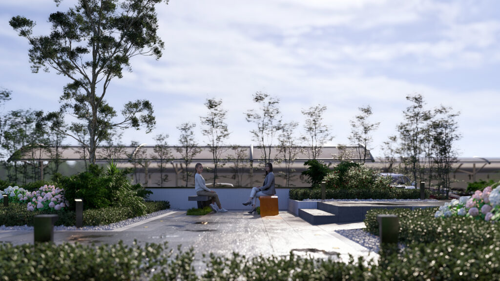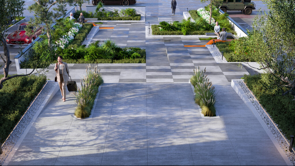 با استفاده از درختان بلند و سایهانداز، محیطی دلپذیر برای کاربران شکل گرفت که همزمان عملکردی دقیق برای تسهیل ورود و خروج خودرو و عابر دارد.