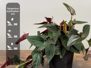 سینگونیوم اریتروفیلم یکی از گونههای جذاب سینگونیوم است که با برگهای سبز تیره و سطح زیرین قرمز-مخملی تضاد رنگی چشمگیری ایجاد میکند. رشد روندهی آن باعث میشود هم در گلدان آویز و هم بر روی قیم جلوهای خاص داشته باشد.