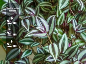 تریدسکانتیا زبرینا، که به نام “گیاه گورخری” نیز شناخته میشود، یک گیاه همیشهسبز با برگهای راهراه بنفش و نقرهای است که به خوبی برای فضای داخلی و گلدانهای آویزان مناسب است. این گیاه دارای ساقههای نازک و رونده و برگهای بیضی شکل با الگوهای راهراه جذاب است که به گیاه ظاهری منحصر به فرد و زیبا میبخشد.